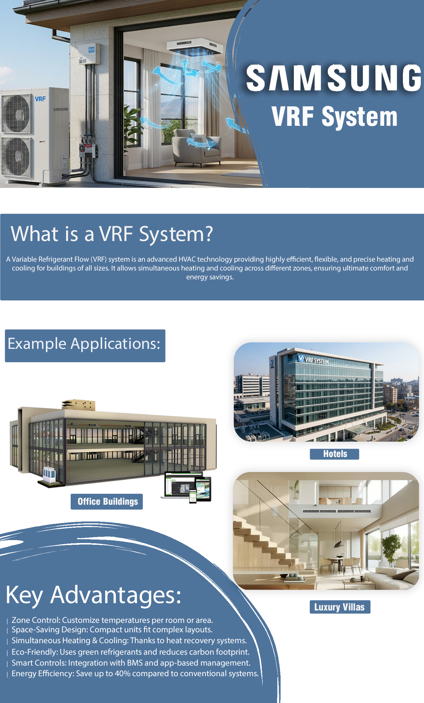Ultimate zoning solution. Samsung DVM S systems allow for precise temperature control in multiple zones, providing comfort to a wide range of occupants. Heat Recovery systems add the capability to heat and cool separate zones simultaneously.